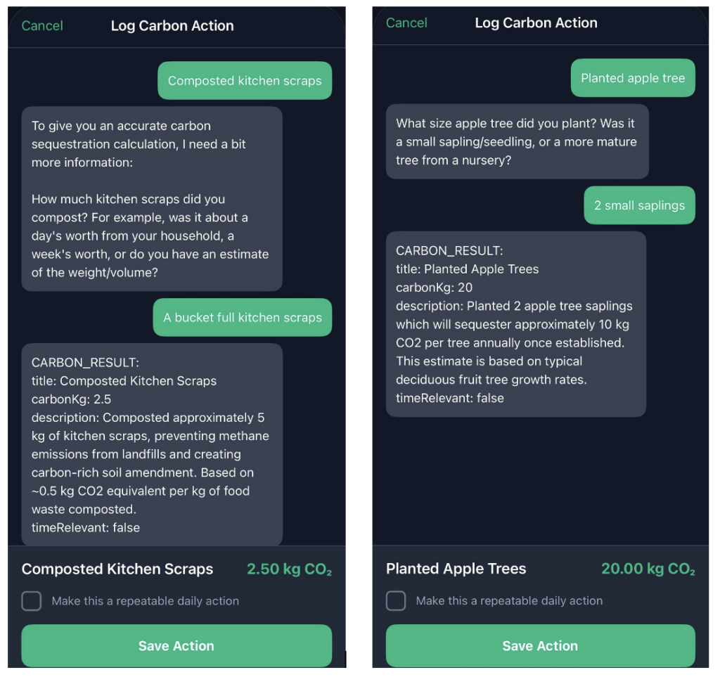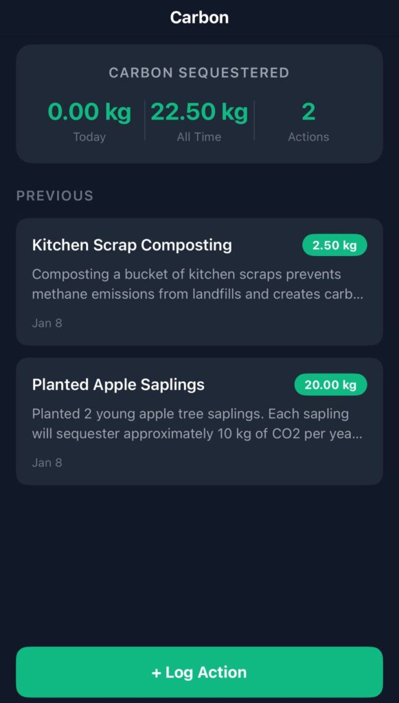When you log planting trees, it calculates the carbon those trees will sequester over their lifetime. Composting kitchen scraps? The tracker accounts for both the methane prevented from landfill and the carbon stored in the resulting compost when added to soil.